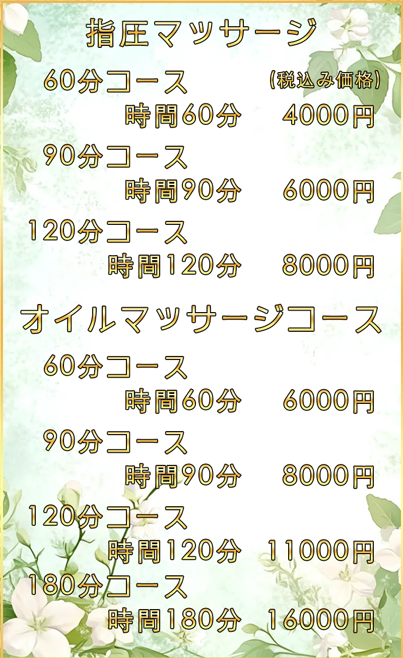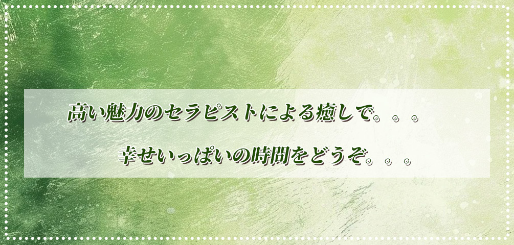当店では、アロマオイルの効能と当店自慢のセラピストによるリンパマッサージの相乗効果による、癒しのひとときをお客様お一人お一人にお届けしております、自然で心やすらぐ優美な香りを、施術中はもちろんご帰宅お休みになってから翌日朝目覚めでまで楽しんで頂けます、どうぞゆっくりご堪能ください。